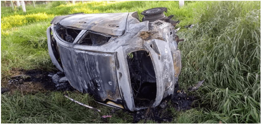 Carro fica destruído depois de capotar e pegar fogo